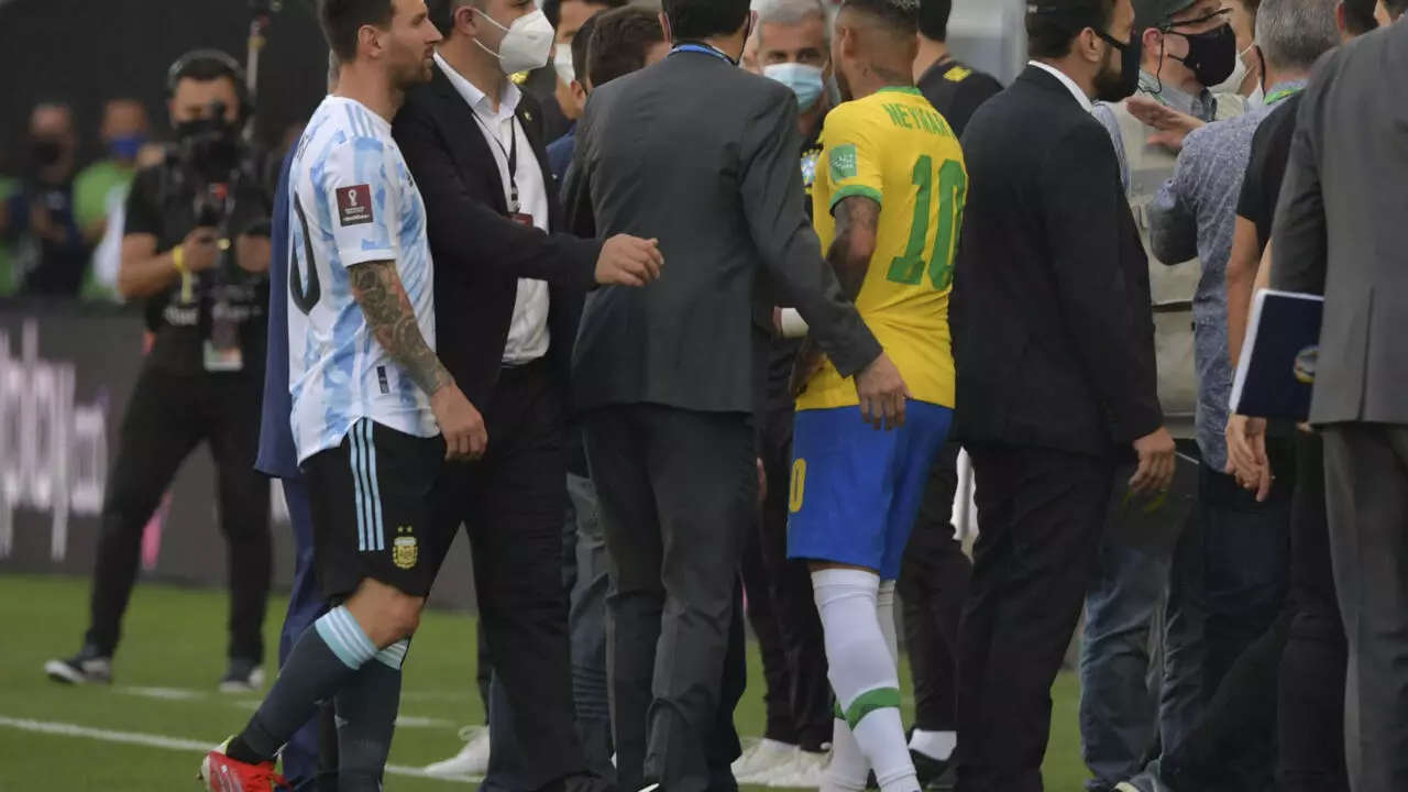 SAO PAULO Sept 5 Reuters - A World Cup qualifier between Argentina and Brazil. World Cup qualifier suspended after health officials walk on to pitch in COVID row. There were incredible scenes during the Brazil v Argentina World Cup qualifier in Sao Pauo on Sunday as health officials came onto the pitch five minutes into the match in.